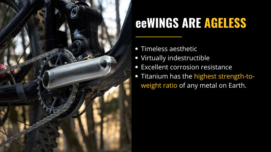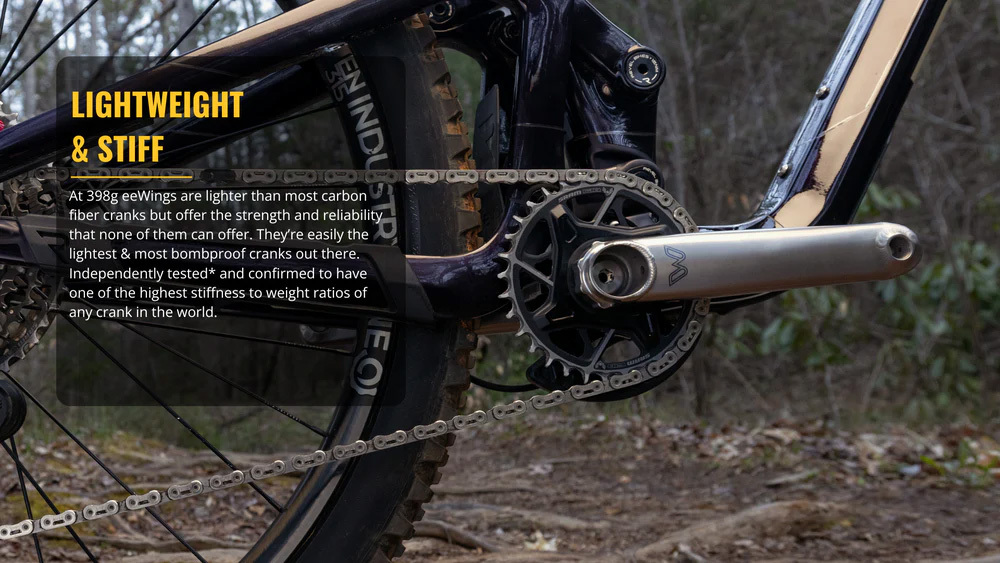 Lighter than carbon, tougher than steel — the eeWings Titanium Cranks deliver unmatched stiffness, durability, and timeless style.