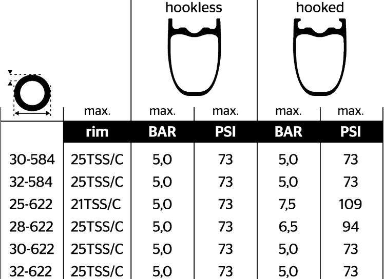 Compatibility and safety information for tubeless ready tires (XX-C = crochet-type rims [hooked]; XX-TSS = tubeless straight-side rims [hookless]):