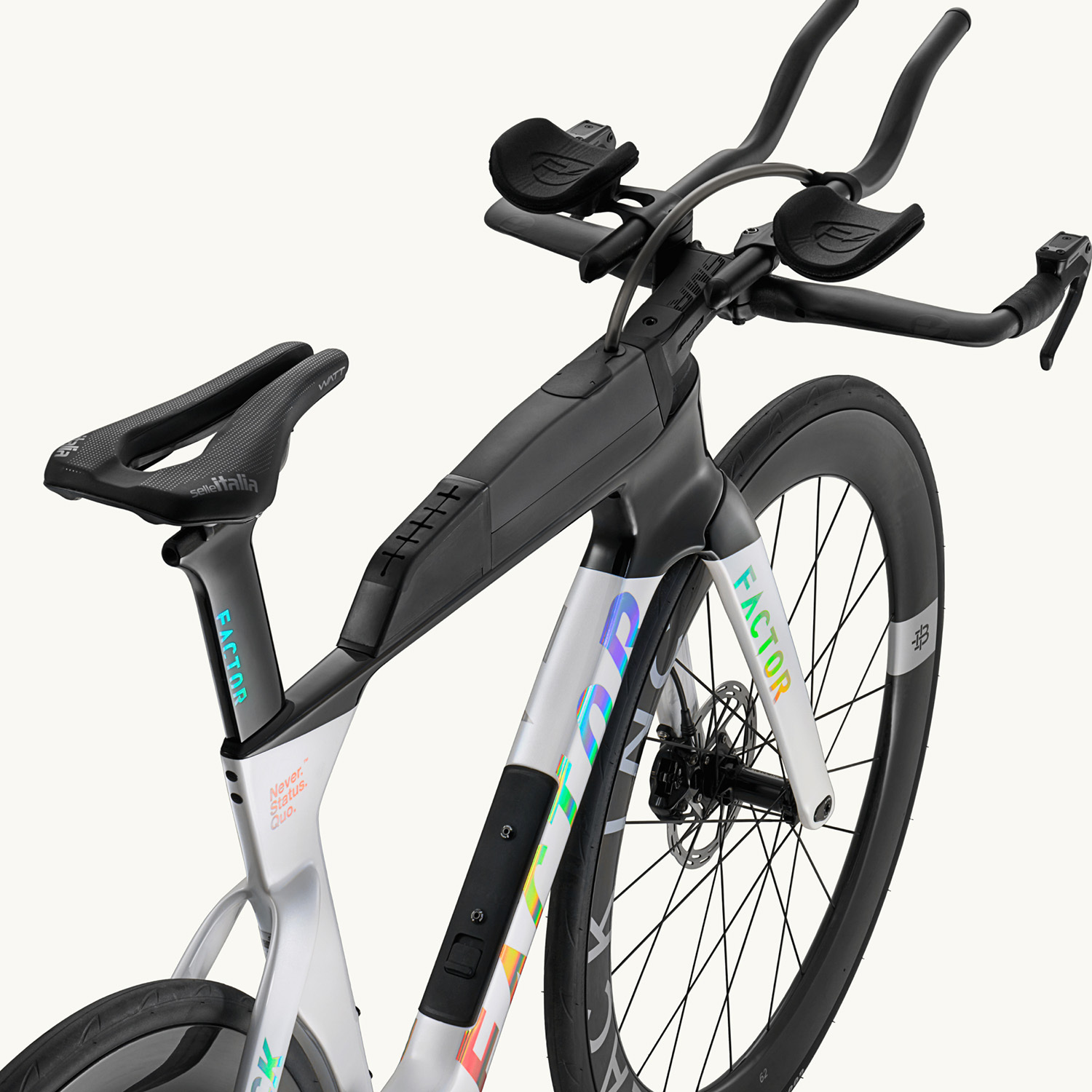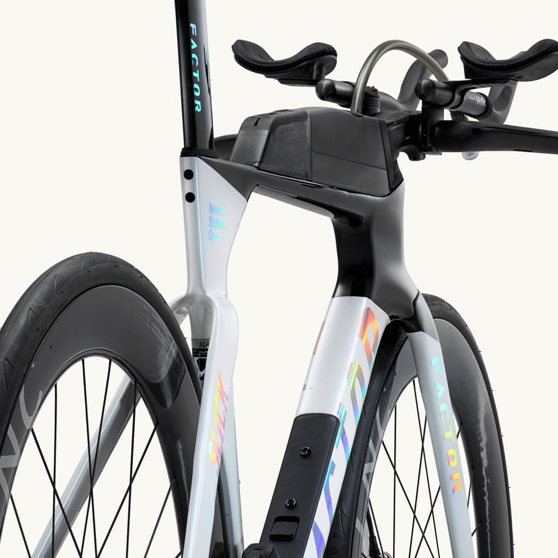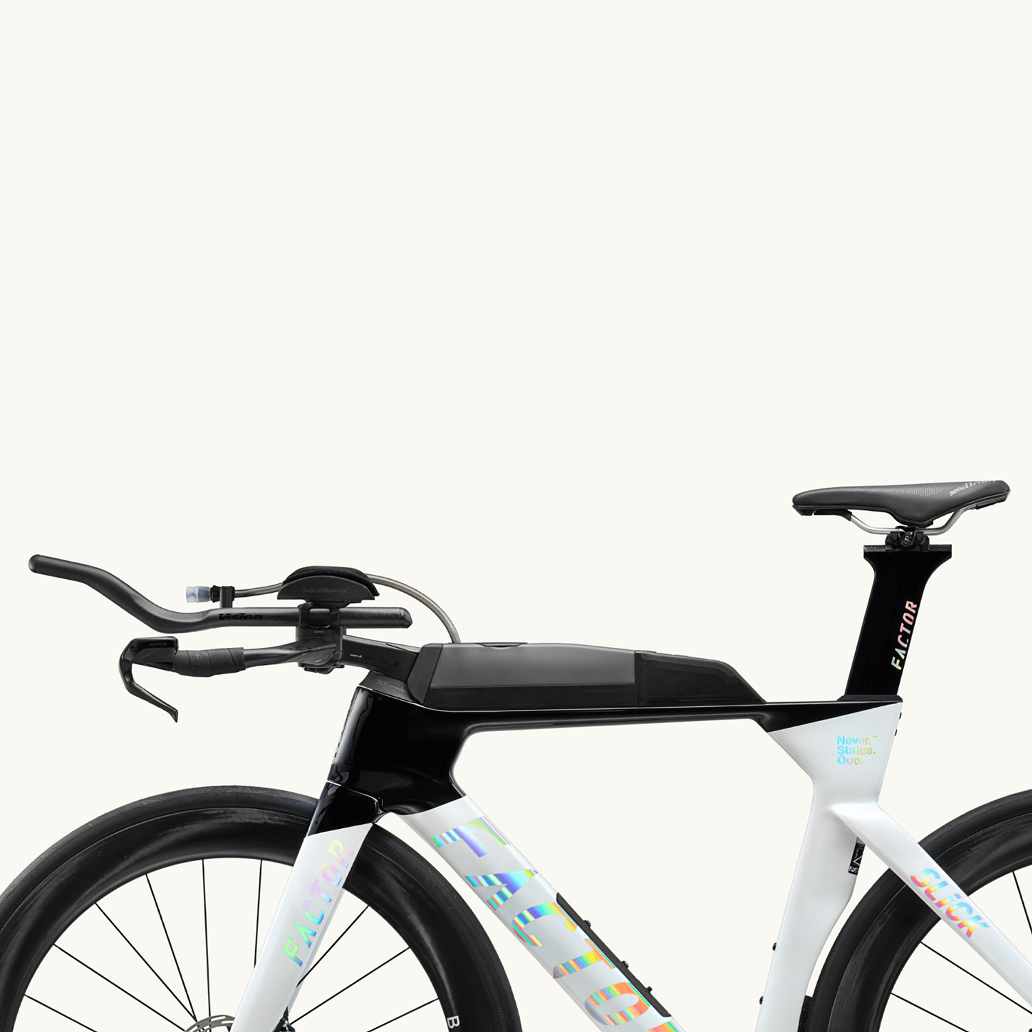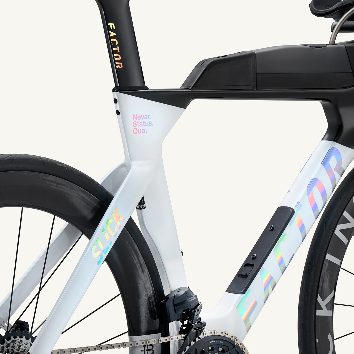 The Factor SLiCK is a purpose-built triathlon frameset that combines superior aerodynamics with unmatched practicality for triathletes of all levels. With advanced carbon fiber manufacturing techniques and a focus on intelligent design, the SLiCK is optimized for performance and convenience, whether for a half or full Ironman race. Its thoughtfully integrated storage solutions and versatile adjustments make it the perfect companion for long-distance triathlons.
