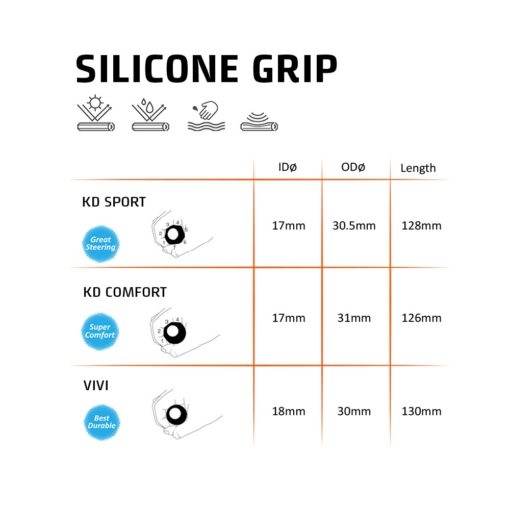Madeby German silicone and engineered with special foaming process, KD comfort gripcreate comfort and great shock absorption during long distance riding. It is UVresistant and heat-proof, not to mention medical grade, KD comfort siliconegrip has clear advantage over traditional coverings.