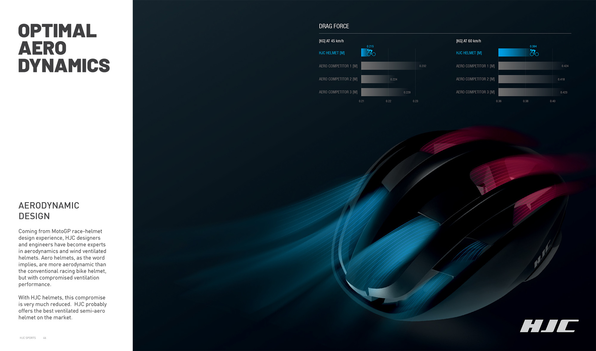 Coming from MotoGP race-helmet design experience, HJC designers and engineers have become experts in aerodynamics and wind ventilated helmets. Aero helmets, as the word implies, are more aerodynamic than the conventional racing bike helmet, but with compromised ventilation performance.