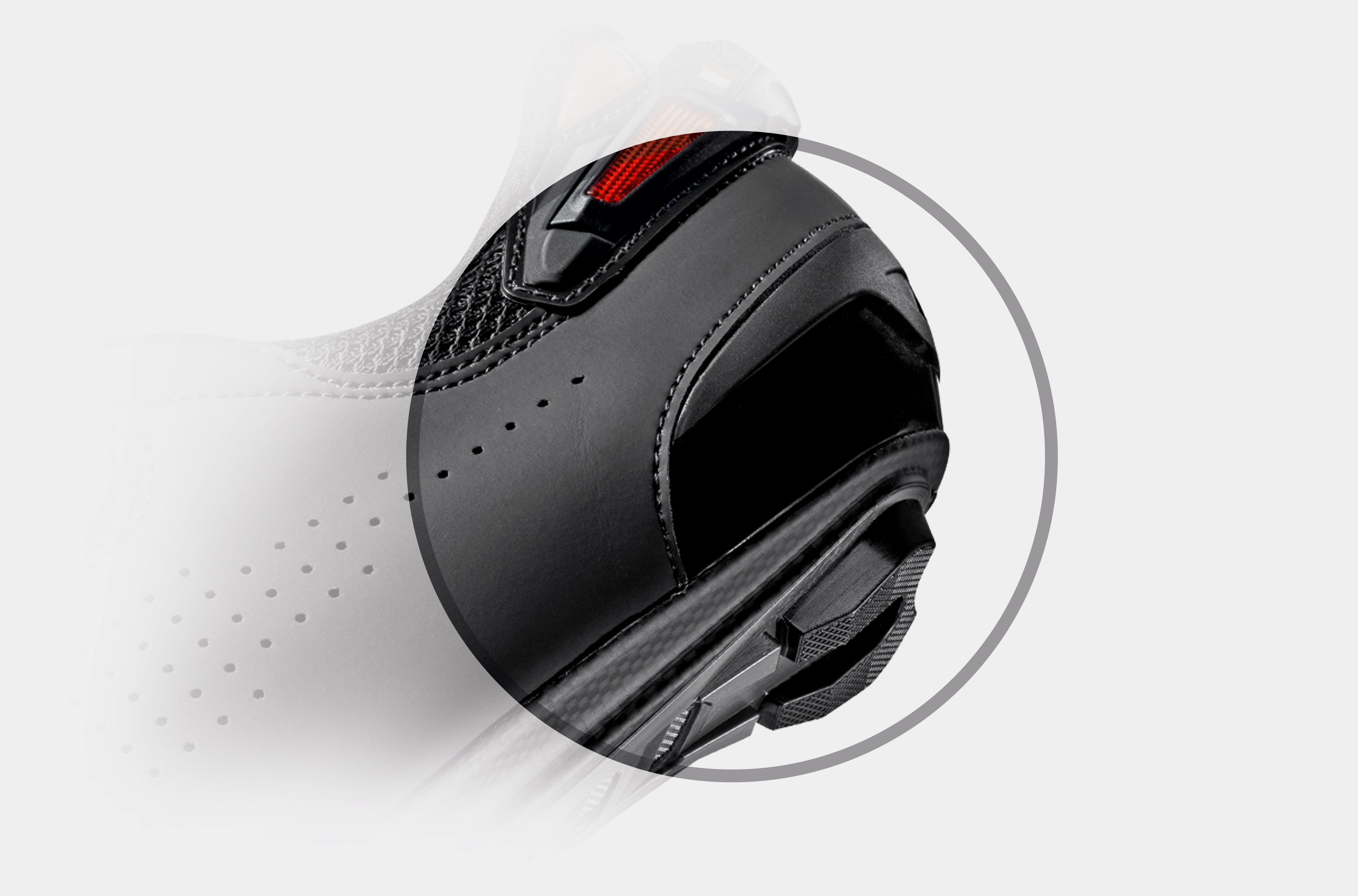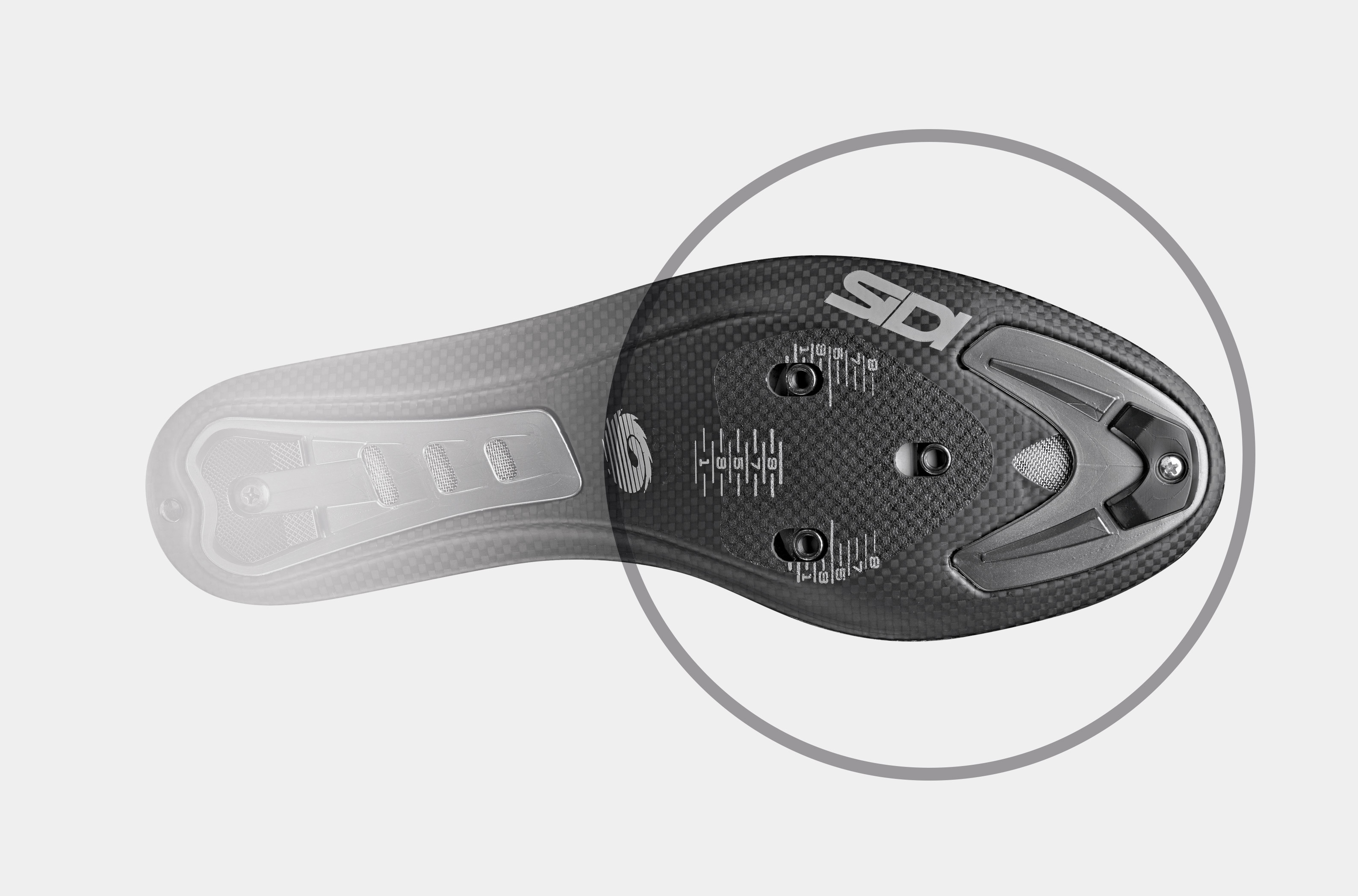 Provided with SRS (Sole Replacement System) inserts in Nylon and TPU, with the function of protecting the carbon in the areas most subject to deterioration from use and for increased durability while walking. The SRS inserts are integrated by ventilation holes that promote the circulation of air inside the sole with each pedal stroke.