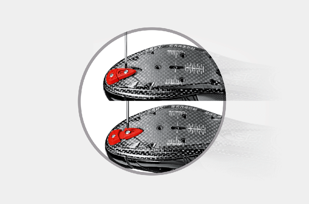 The ADJUSTABLE HEEL RETENTION DEVICE reinforces the top of the heel cup and improves the fit by closing the back of the shoe securely around the rider’s heel. The heel retention device tightens the top of the heel cup so that the heel doesn’t slide out during steep climbs or sprints.