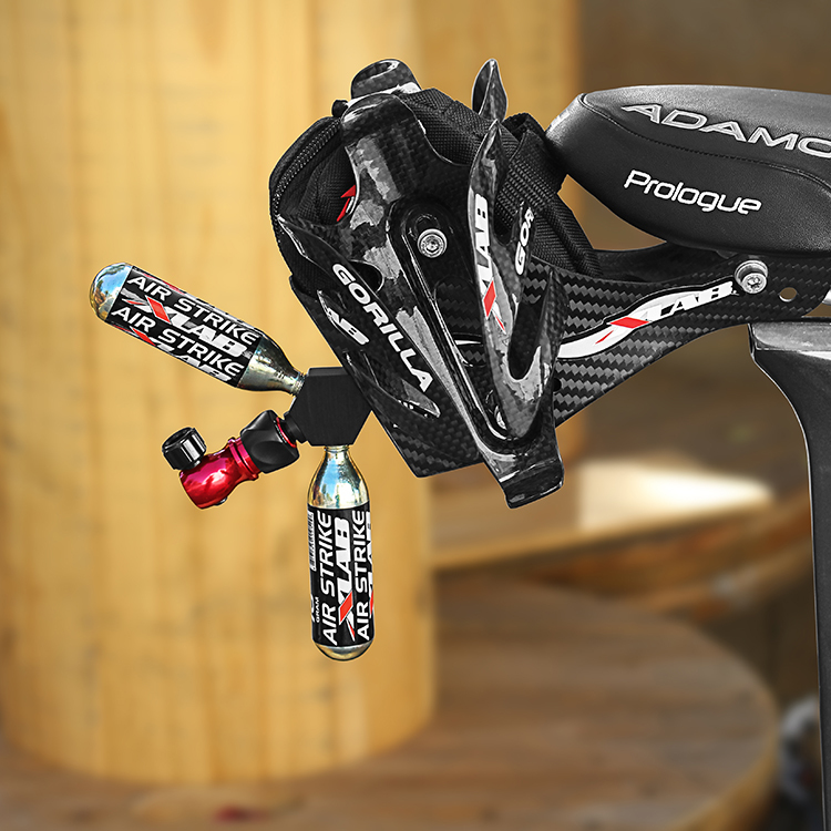 An excellent way to hold your XLAB AirStrike CO2 Cartridges and XLAB Nanoflator or Speed Chuck. Attaches to XLABCarbon Wing and Super Wing systems. Makes inflating tires a snap duringtraining rides or out on the race course. Holds up to two XLAB Air Strike CO2Cartridges. Made in the USA. Color Black. Mounting Hardware included.