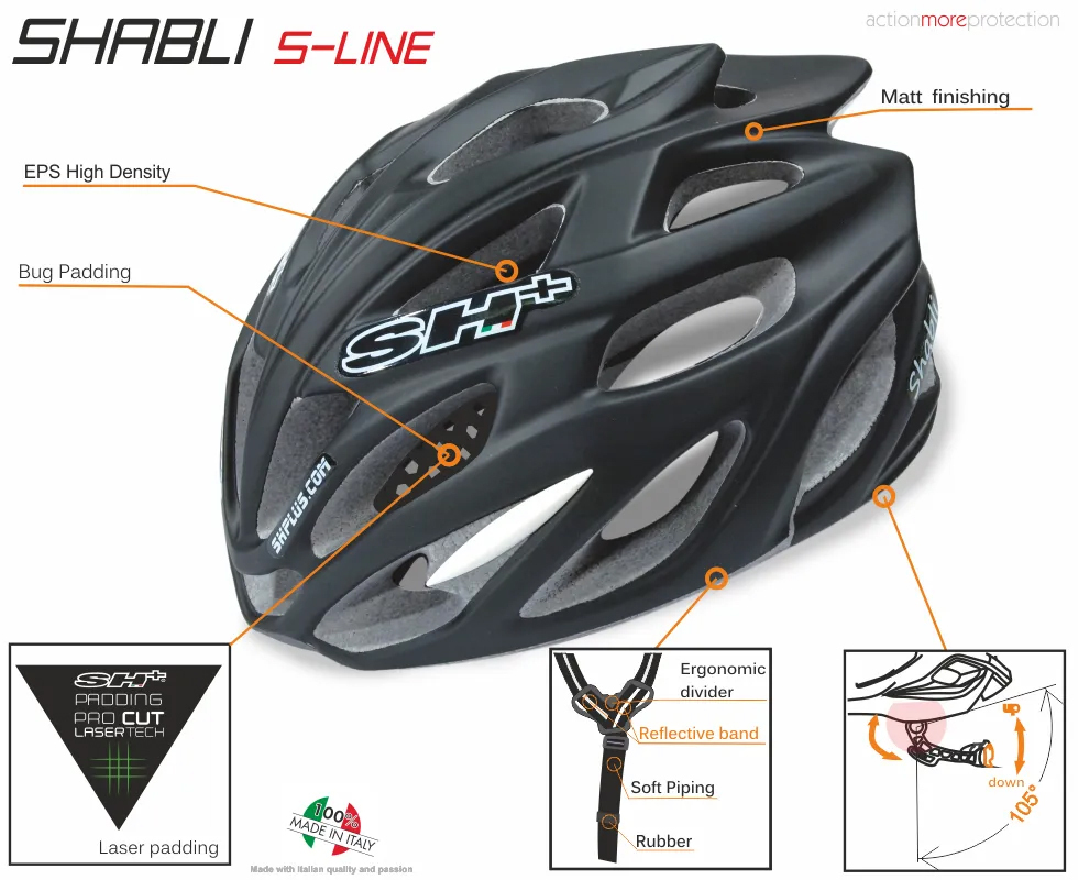 It is a combination of innovation and aggressive design. To ensure the safety and speed of the athletes, SH + is committed to innovation from the point of view of style and comfort: weight reduction, ventilation optimization and maximum aerodynamics during sports activities are the company’s priorities. Shabli X-plod is aerodynamic, it is equipped with large air intakes that make it super breathable.
