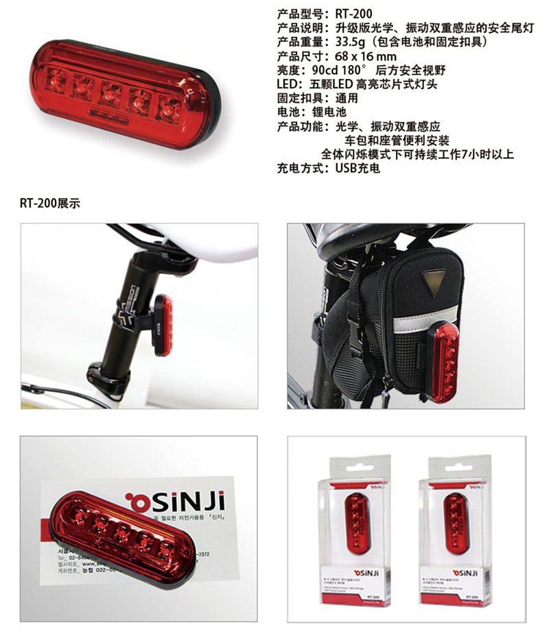 Slim & Smart rear light that illuminateyour rear with 90 Candle power of brightness at an angle of 180° view. RT-200is small and light-weight and yet does not compromise the brightness itdelivers. The clip-on design allows you to mount the light on your bike eitherusing the free size mounting bracket or just slot it behind your saddle bag. Itcomes with a light & vibration sensor mode which will automatically on/offthe light depends on the light condition and your bike movement. It is usingUSB rechargeable internal Li-Ion battery. And there are also light indicatorsto show you the battery and charging status.