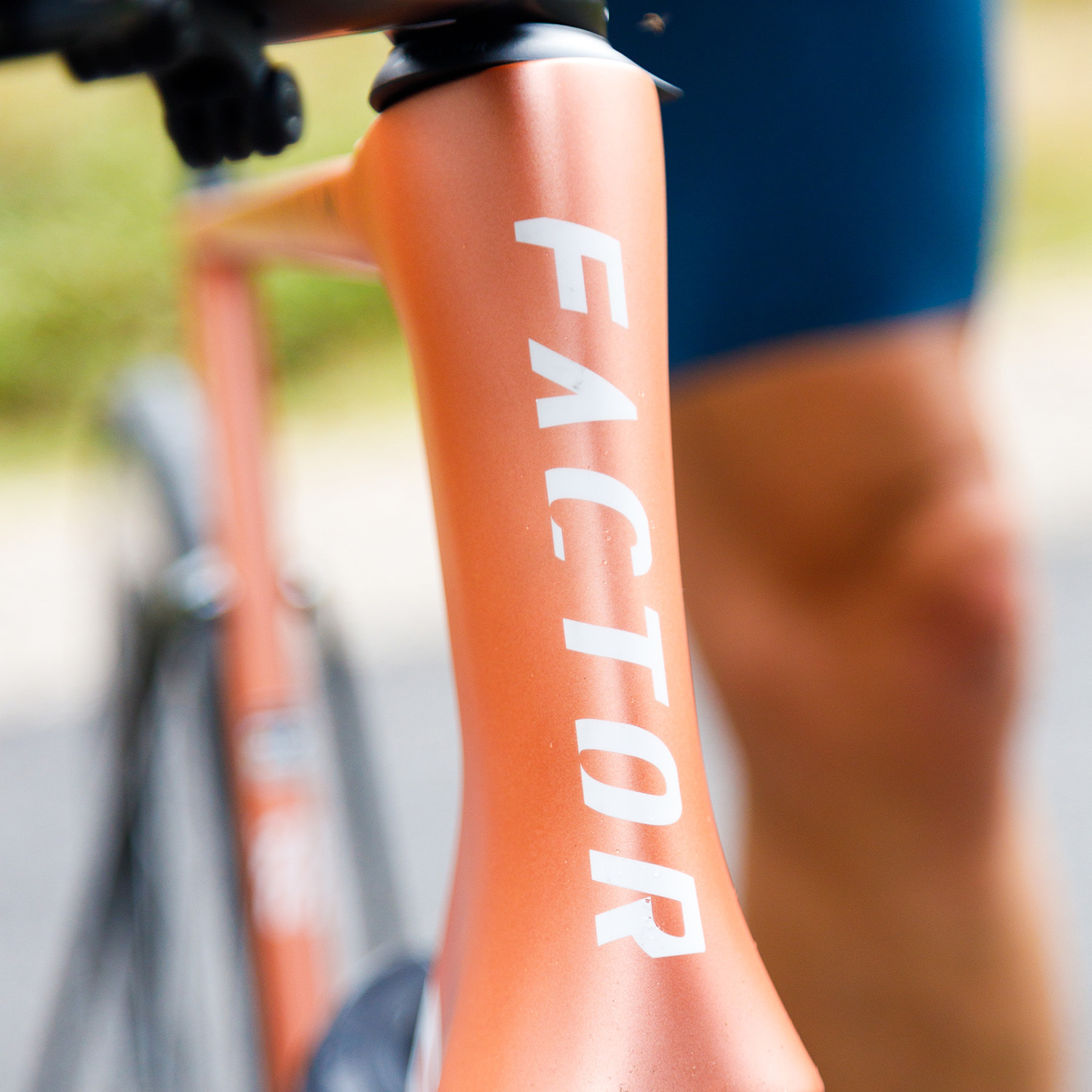 車架上的 “Factor” 字樣以白色為主,這與銅色的車架形成了鮮明的對比,顯得非常醒目,品牌標誌也因此更加突出。另外,在車架的其他細節部分,像是變速器、座管和車頭,也使用了黑色和灰色這些低調但經典的顏色來平衡整體設計。