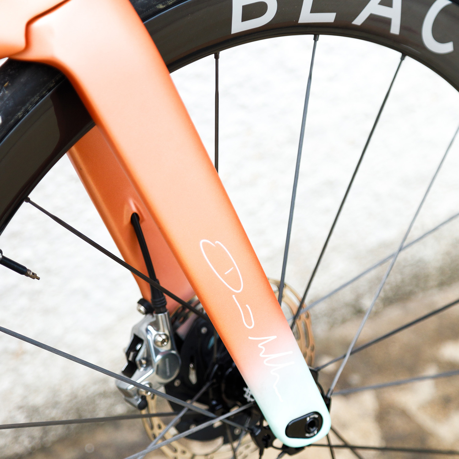 David Millar Edition的主體以銅色和玫瑰金為主調,呈現出一種高級且奢華的感覺。這種金屬感的顏色讓車架在光線下散發出獨特的光澤,象徵著速度、力量與專業水準。