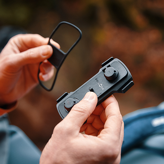TWIST tex base multi 現在有“二合一”的設計版本。底座能以橡膠環簡單地綁接到任何肩帶上,或者是傳統的方法在肩帶上插入兩個塑料板之間並用磁性螺絲頭固定。