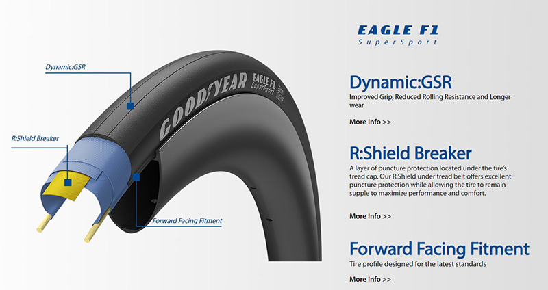 專有的合成橡膠和天然橡膠的混合物,是加入石墨烯和二氧化矽開發出來的全新的Dynamic:GSR複合材料,提供出色的滾動效率,牽引力和耐久性。